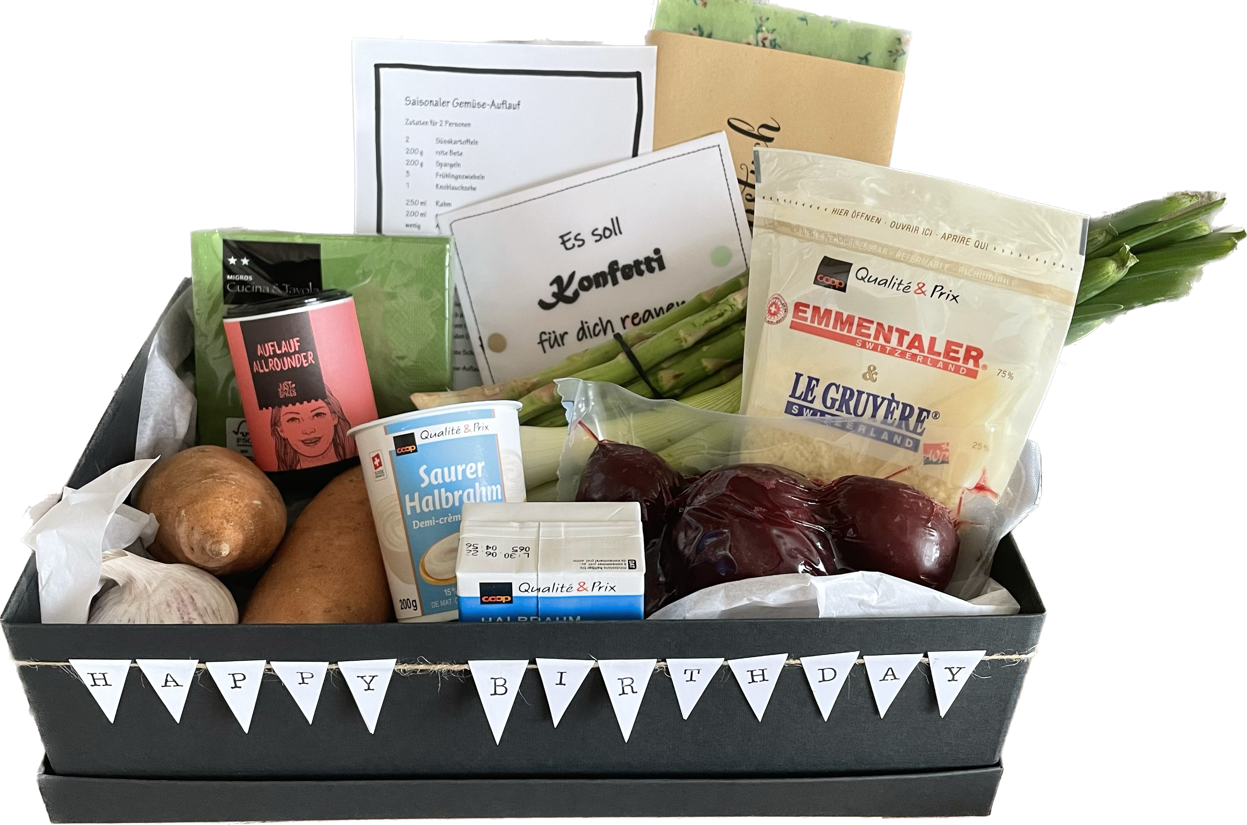 Die Kosten setzen sich aus dem Einkaufspreis des Inhaltes (Ihrem Budget und Ihren Wünschen angepasst) und dem Aufwand (CHF 30 - 50) zusammen.
